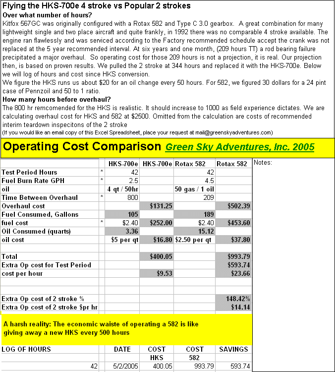 Your absolutely right of purchase cost to be included here. I'm a big fan of the Jabiru 2200, because it gets about the same gph as the HKS, but at 12k+ big ones, my cheap old 503 looks attractive again. Also my buddy has to run av gas in his, which is about $5.75 a gallon here, compared to $3.25 for automobile premium, so the gas cost per mile is kind of a wash. The TBO is not a big deal for me either, because at 60-75 hours a year it will take me a while to wear out the 503 or 582 and justify big bucks for an upgrade. Hell, by then Mark will have our electric powerplant ready!!
